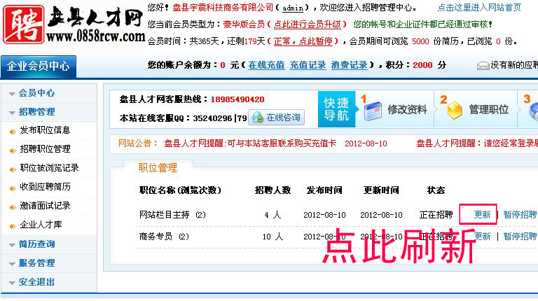 因?yàn)楸菊局黜?yè)只顯示80個(gè)企業(yè)的招聘信息,多余的將不顯示,所以請(qǐng)您經(jīng)常登錄企業(yè)帳號(hào)刷新職位,以便獲得更好的展示機(jī)會(huì)同時(shí)也以此證明您的招聘還是繼續(xù)!